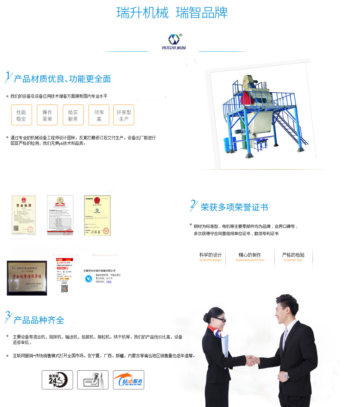 安徽瑞升機械制造有限公司坐落在明光市工業(yè)園區(qū),本公司產(chǎn)品主要用于粉料物質(zhì),顆粒物質(zhì)的混合、攪拌、輸送、包裝的自動化生產(chǎn)設備。工廠占地面積為1萬多平方現(xiàn)有6000平方米的生產(chǎn)車間和各類加工檢測設備,具備產(chǎn)品開發(fā)、研制、設計、生產(chǎn)、試驗、倉儲運輸?shù)饶芰?,可以生產(chǎn)多種規(guī)格、多種非標定制的產(chǎn)品,并有多項技術獲得國家專利,擁有自主進出口權,公司憑借優(yōu)良的技術、先進的工藝和科學的管理理念,所生產(chǎn)的產(chǎn)品已暢銷全國各地,部分產(chǎn)品已進入馬耳他、印度尼西亞、韓國、羅馬尼亞、沙特阿拉伯、馬來西亞、印度、巴基斯坦、等國家和地區(qū),受到國內(nèi)外客戶的高度認可和信賴。 本公司獲得守合同重信用單位證書,對原材料的采購極為細致,鋼材為標準型,電機等主要零部件均為品牌,數(shù)項專利證書。技術方面我司擁有一支國內(nèi)的技術和管理團隊,在機械設備應用...公司資質(zhì)榮譽